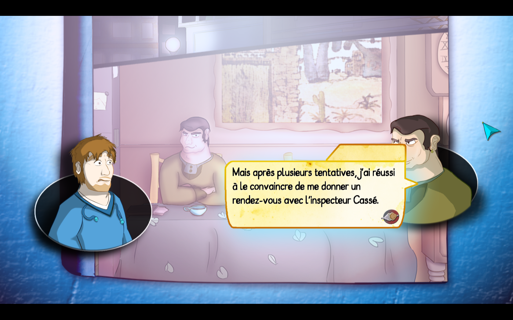 Depuis un an je travaille sur un jeu d'aventure Point & Click dans le style des Chevaliers de Baphomet. Mais avec un humour... différent ;)